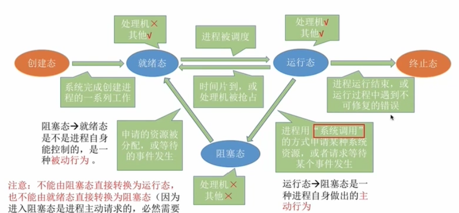 - 就绪态(Ready)。已经具备运行条件,但由于没有空闲CPU,暂时不能运行。CPU x,其他资源 √