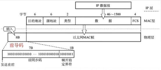 - 头部:目的地址、源地址、类型(指定网络层使用的协议)