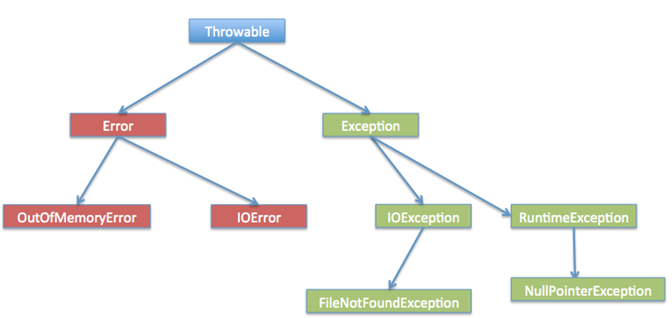 - 需要用 try…catch… 语句捕获并进行处理,并且可以从异常中恢复。我们必须捕获此类异常,并为用户提供有用信息和合适日志来进行调试。