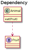 是一种使用的关系,即一个类的实现需要另一个类的协助,所以要尽量不使用双向的互相依赖,在程序中一般表现为类A中的方法需要类B的实例作为其参数或者变量,而类A本身并不需要引用类B的实例作为其成员变量。